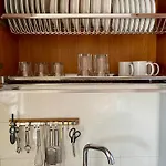 Dit appartement biedt voorzieningen voor het zelf koken, zoals een complete keuken, en een eethoek buiten voor het gemak van de gasten.
